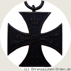 Bronzenes Kreuz, in Form des Eisernen Kreuzes, mit erhöhtem glatten Rand, die Innenseiten sehr fein gekörnt. Oben eine angelötete Öse mit Bandring.