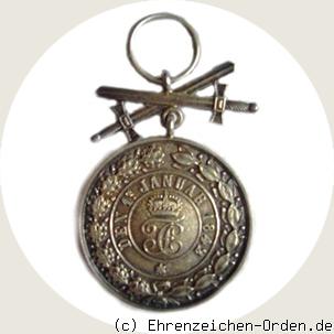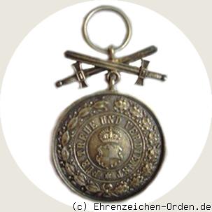 Die goldene Ehrenmedaille und die silberne Verdienstmedaille wurden gemeinsam mit dem gemeinsamen Ehrenkreuz, später Fürstlicher Hausorden von Hohenzollern, am 5. Dezember 1841 durch die beiden hohenzollern Fürsten gestiftet. Die erste Form (Modell) der goldenen Ehrenmedaille hatte eine goldene gefütterte Krone und war ursprünglich die 3.Klasse des Ehrenkreuzes und wurde für ausgezeichnete Verdienste an Staats-und Hofbeamte im hohen Rang eines Kollegialrates oder Amtsvorstand verliehen. Militärs hatten einen Rang über dem Hauptmann. Im April 1844 wurden die Medaillen aus Silber vergoldet hergestellt und das Ehrenkreuz 3.Klasse eingeführt. Die silberne Verdienstmedaille (ohne Krone) stellte bis zum 8.April 1844 die 4.Klasse des Ehrenkreuzes dar. Am 23.August 1851 stiftete König Friedrich Wilhelm IV. eine besondere Abteilung des Hausordens, den Königlichen Hausorden der Hohenzollern. Der Hausorden der Hohenzollern zerfiel in 2 unabhängig voneinander existierende Hausorden, den Orden des königlichen Hauses von Preußen und den Orden des fürstlichen Hauses von Hohenzollern. Das 2. Modell, das sogenannte Zwischenmodell, hatte eine emaillierte Krone und ein schwarz/weißes Wappen mit roter Fütterung der Krone. Am 16.Februar 1852 wurden die Statuten geändert. Das 3.Modell hatte neue, geänderte Stempel für die Vorder- und Rückseite in Form des Medaillons des Ehrenkreuzes 2.Klasse. Die 1. Ausgabe trug auf der Rückseite das richtige Datum der Stiftung 5.Dezember 1841. Die hier abgebildete Ehrenmedaille bildet das 3. Modell 2. Ausgabe und unterscheidet sich durch das Datum 1.Januar 1842 das für die Rückseite eingeführt wurde. Die Umstellung erfolgte wohl mit der Statutenänderung 1852. Die vergoldeten Schwerter wurden am 20. Dezember 1866 für alle Klassen gestiftet und erstmals für die silberne Verdienstmedaille verliehen. Empfänger waren Unteroffiziere und Soldaten des Hohenzoller Füsilierregiments Nr.40 unter Fürst Carl Anton. Im Weltkrieg erfolgte die Verleihung an Unteroffiziere und Soldaten unter Fürst Wilhelm von Hohenzollern. Quelle: Jörg Nimmergut, Deutsche Orden und Ehrenzeichen bis 1945, Bd. I, 1997.