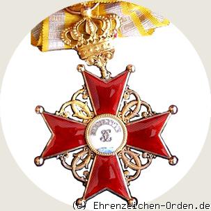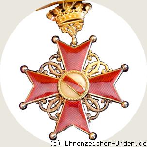 Goldenes Kreuz in Malteserform. Die Enden der Kreuzarme mit kleinen goldenen Kugeln. Die Kreuzarme sind gold bordiert und rot durchscheinend emailliert. Vorder- und Rückseite mit aufgelegtem runden Mittelschild. Zwischen den Kreuzarmen jeweils der doppelte, verzierte und gespiegelte Buchstabe – C – für Carl. Zwischen den Spitzen des oberen Kreuzarmes eine parallele Öse in der die Krone mittels verzierter Agraffe eingehängt ist. Durch den Reichsapfel der Krone geht der Bandring. Im Ring eine Goldpunze.