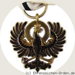 Orden in Form eines stehenden Adlers aus Gold. Der Adler ist gold bordiert und schwarz emailliert. Der Kopf umgeben von einem runden Reif. Oben auf dem Reif eine angelötete Öse mit Bandring.