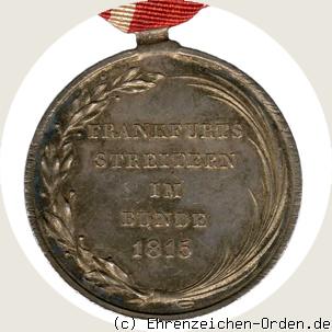 Diese Kriegsdenkmünze wurde durch Senatsbeschluss am 30. Januar 1816 gestiftet. Verliehen wurde die Medaille an die Freiwilligen und Soldaten des Linien-Militärs aus dem Gebiet der Stadt Frankfurt die im Krieg gegen Frankreich ab dem 14. Juni 1915 im Frankfurter Bataillon beteiligt waren. Die frankfurter Truppen haben am Gefecht in Selz am 26. Juni 1815 und an der Einschließung Straßburgs teilgenommen.