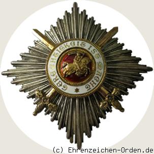 Vierstrahliger Bruststern aus Silber. Zwischen den vier Hauptstrahlen jeweils 9 gleichmäßig abgestufte Zwischenstrahlen. Die Einzelstrahlen sind seitlich mit schmalen Linien eingefasst. Mittig auf der Vorderseite aufgelegt ein rundes, goldenes und emailliertes Medaillon (34,5 mm). Hinter dem Medaillon gekreuzt 2 antike, goldene Schwerter mit floral gestalteten Parierstangen. Die Rückseite glatt silbern mit mittiger, runder Abdeckplatte und senkrechter Anstecknadel mit Gegenhaken. Diagonal 4 Nieten sichtbar (Befestigung der Schwerter).