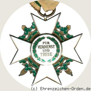 Achtspitziges goldenes Kreuz. Vorder-und Rückseite mit aufgelegtem runden Medaillon. Die Kreuzarme weiß emailliert und gold gerändert. Auf der Vorderseite durch die Mitte 2 goldene, antike Schwerter. Zwischen den Kreuzarmen grün emaillierte Segmente in Form der Rautenkrone, auf der Vorderseite von den Schwertern überlagert. In der Mitte des oberen Kreuzarmes eine angelötete Öse mit Bandring.