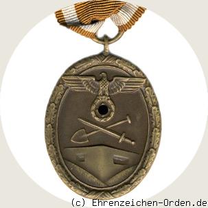 Gestiftet wurde diese Auszeichnung am 2.August 1939 durch Reichskanzler Adolf Hitler als sichtbarer Ausdruck des Dankes und als Anerkennung für Verdienste um die Anlage und Errichtung des deutschen Schutzwalles. Vorschläge zur Verleihung erfolgten durch den Chef des Oberkommandos der Wehrmacht, für Wehrmachtsangehörige, durch den Generalinspekteur des deutschen Straßenwesens und durch den Reichs-Arbeits-Dienst (RAD) gemacht. Die Vorschläge wurden dann durch die Präsidialkanzlei dem Reichskanzler zur Entscheidung vorgelegt. Ausschlaggebend war der Einsatz zwischen dem 15.Juni 1938 bis zum 31.August 1939. Die allgemeinen Verleihungsvoraussetzungen forderten einen 10-wöchigen Einsatz in dieser Zeit. Ausnahmen wie Einberufung zur Wehrmacht, Krankheit oder Unfälle wurden berücksichtigt. Der Antrag musste zusammen mit der Personalkarte, einem polizeilichen Führungszeignis und dem Arbeitsbuch beim zuständigen Arbeitsamt vorgelegt werden. Wehrmachtsangehörige, denen die Sudetenlandmedaille oder die Memelandmedaille verliehen worden war, waren von der Verleihung ausgeschlossen. Ebenso erhielten Arbeiter im Straßenbau-Sofortprogramm im Osten die Sudetenlandmedaille und nicht das Schutzwall-Ehrenzeichen. Eine Erweiterung der Empfangsberechtigten wurde 1944 vorgenommen. Jetzt haben auch Personen die beim Stellungsbau beteiligt waren das Ehrenzeichen erhalten. Zur Verleihung gehörte ein Besitzzeugnis. Der Entwurf stammt von Professor Richard Klein aus München. Das Ehrenzeichen wurde in Bronze und zum Kriegsende aus bronziertem Zink hergestellt. Die Medaillen weichen je nach Hersteller in Größe und Gewicht von einander ab. Als Hersteller sind Wilhelm Deumer, Steinhauer & Lück, Wernstein, Carl Poellath, Werner Redo, Rudolf Souval und August Menze & Sohn bekannt, um nur einige zu nennen. Herstellersignaturen sind, wenn vorhanden, im Bandring mit Nummer eingeschlagen. Insgesamt wurden bis 1941 ca. 622.000 Medaillen verliehen.