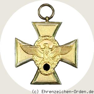 Gestiftet wurden die Dienstauszeichnungen für die Polizei am 5 Jahrestag der Machtergreifung durch die Nationalsozialisten am 30.Januar 1938 durch Führer und Reichskanzler Adolf Hitler. Die Auszeichnung bestand aus 3 Stufen. Die 1.Stufe für 25 Jahre treue Dienste, die 2.Stufe für 18 Jahre und die 3.Stufe für 8 Jahre treue Dienste in der Polizei. Die 1. und 2. Stufe sind Kreuze, vergoldet bzw. versilbert. Die 3.Stufe ist eine Medaille. Bei der Berechnung der Dienstzeit wurden Wehrdienstzeit und Zeiten als Beamter angerechnet. Personen die aus der NSDAP ausgestoßen wurden konnten nicht ausgezeichnet werden. Ab 1940 konnten auch wiedereingestellte Ruheständler bzw. Beamte ausgezeichnet werden. Dabei zählte die Zeit vor dem Ruhestand und die Zeit nach Wiedereinstellung. Ab 1941 waren auch Polizeireservisten und ab 1942 Angehörige der Luftschutzpolizei empfangsberechtigt. Ab November 1941 wurde die Verleihung auf Österreich und das Sudetenland ausgeweitet. Am 12. August wurde ein Eichenlaub in Gold mit der Zahl 40 gestiftet. Dieses wurde aber nicht mehr hergestellt oder verliehen. Die Verleihungen endeten am 19. Dezember 1944. Die Dienstauszeichnung für 25 Jahre hat auf dem Band einen gelben Polizei-Hoheitsadler eingestickt. Es kommen Kreuze in Bronze vergoldet oder Kriegsmetall vergoldet vor. Quelle: J. Nimmergut, Deutsche Orden und Ehrenzeichen bis 1945, Bd. IV, 2001.