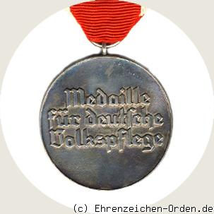 Mit Zustimmung des Präsidenten des Deutschen Roten Kreuzes wurden die bis dahin verliehenen Auszeichnungen durch das Ehrenzeichen für deutsche Volkspflege abgelöst. Gestiftet wurde es am 1.Mai 1939 durch Verordnung des Reichskanzlers Adolf Hitler. Verliehen wurde es in 4 Klassen (Stufen) für Verdienste auf dem Gebiet der Volkswohlfahrt, Winterhilfswerk, Pflege der Kranken und Verwundeten in Krieg und Frieden, Rettungswesen sowie Pflege und Fürsorge Deutscher im Ausland. Die 4.Stufe stellt die Medaille für deutsche Volkspflege dar. Bei Verleihung einer höheren Stufe war das Ehrenzeichen an die Präsidialkanzlei zurückzugeben. Bei Tod des Beliehenen verblieb die Medaille bei den Hinterbliebenen. Ab 1942 konnte die Medaille für Verdienste bei besonderen Gefahren im Kriege auch mit Schwertern auf dem Band verliehen werden. In der Whermacht wurde die Medaille vom Oberleutnant abwärts verliehen. Eine Verleihung an Reichsangehörige und Ausländer war möglich. In der Volkswohlfahrt war ab 1942 eine 2-jährige Tätigkeit Voraussetzung. Ebenso konnte bei runden Jubiläen und Geburtstagen eine Verleihung erfolgen. NSV-Schwestern waren empfangsberechtigt wenn sie in einem Seuchenlazarett oder direkt bei der Versorgung und Pflege von Verwundeten 1 Jahr tätig waren. Die Verleihungen fanden jeweils zum 30. Januar und zum 1. Mai statt. Ausnahmen waren möglich. Zur Medaille gehörte eine Urkunde mit der Faksimile Adolf Hitlers und dem Chef der Präsidialkanzlei. Bis 1940 wurden ca. 47.000 Medaillen verliehen. Quelle: J. Nimmergut, Deutsche Orden und Ehrenzeichen bis 1945, Bd. IV, 2001.