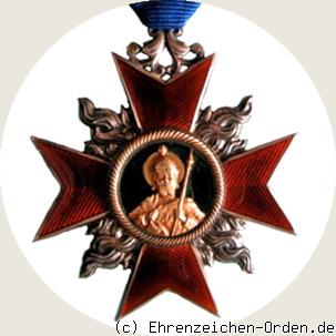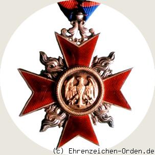 Vergoldetes Kreuz aus Silber in Malteserform. Die Kreuzarme sind rot glasemailliert mit durchscheinender Schraffur. Vorder- und Rückseite mit aufgelegtem, runden, goldenen Medaillon. Zwischen den Kreuzarmen vergoldet lodernde Flammen mittig länger werdend. Zwischen den Spitzen des oberen Kreuzarmes eine verzierte Agraffe mit Kugelöse und Bandring. Auf dem Bandring ein Silberstempel 800 oder 900.