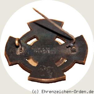 Gedunkeltes oder versilbertes Steckkreuz aus Bronze mit geschweiften Kreuzarmen. Die Kreuzarme mit erhöhten glatten Rändern. Die Innenseiten fein gekörnt. Mittig aufgelegt ein rundes, emailliertes Medaillon. Rückseite mit senkrechter Anstecknadel und Herstellerbezeichnung.
