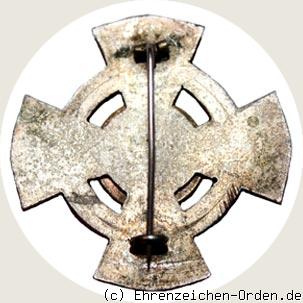 Versilbertes Steckkreuz aus Bronze mit geschweiften Kreuzarmen. Die Kreuzarme mit silbernen Rändern sind weiß emailliert. Mittig aufgelegt ein rundes, emailliertes Medaillon. Die Rückseite glatt versilbert mit senkrechter Anstecknadel mit Gegenhaken. Wenn mit Hersteller dieser mittig.