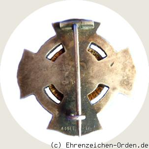 Versilbertes Steckkreuz aus Bronze mit geschweiften Kreuzarmen. Die Kreuzarme mit glatten erhöhten Rändern. Die Innenseiten sind fein gekörnt. Mittig aufgelegt ein rundes, emailliertes Medaillon. Die Rückseite mit senkrechter Anstecknadel und Herstellerbezeichnung.