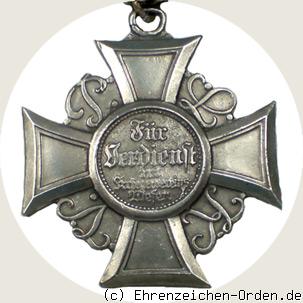 Versilbertes Kreuz aus Bronze mit leicht gebogenen Kreuzarmenden. Vorder-und Rückseite mit rundem Medaillon. Zwischen den Kreuzarmen Segmente mit Buchstaben. Am oberen Kreuzarm angefügt eine Öse mit kleinem Ring und Bandring. Auf der Öse die Herstellerbezeichnung H.Timm Berlin.