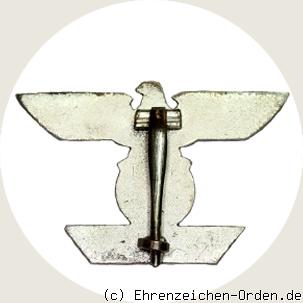 Versilberte Spange in Form eines Adlers mit gespreizten Flügeln, der auf einem Eichenlaubkranz mit darunter liegendem Schild sitzt. Auf der Rückseite eine senkrechte Anstecknadel.