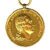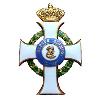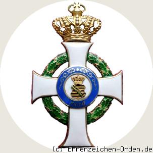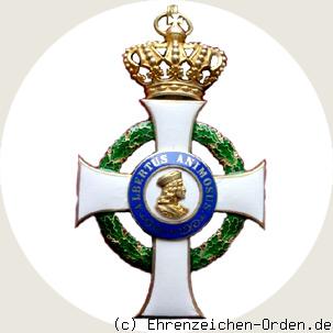 Längliches Kreuz aus Gold oder vergoldetem Silber mit weiß emaillierten Kreuzarmen. Vorder und Rückseite mit aufgelegtem runden Medaillon. Zwischen den Kreuzarmen in kleinem Abstand ein grün emaillierter Eichenlaubkranz. Auf dem oberen Kreuzarm ist die goldene Krone beweglich befestigt. Durch den Reichsapfel der Krone geht ein kleiner Ring mit länglichem Bandring. Auf dem unteren Kreuzarm Hersteller – S – für Scharffenberg.