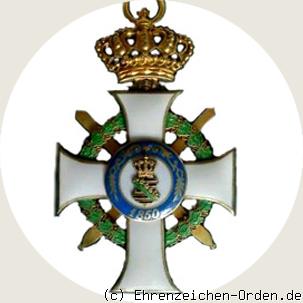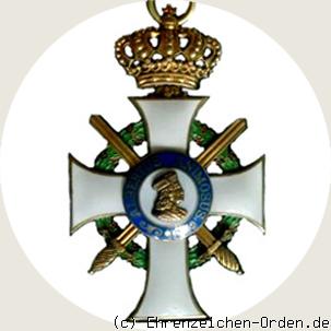 Längliches Kreuz aus Gold oder vergoldetem Silber mit weiß emaillierten Kreuzarmen. Vorder und Rückseite mit aufgelegtem runden Medaillon. Zwischen den Kreuzarmen in kleinem Abstand ein grün emaillierter Eichenlaubkranz. Durch die Mitte zwei gekreuzte vergoldete Schwerter (rückseitig vom Eichenlaubkranz überlagert). Oben eine Trageagave an der die goldene Krone befestigt ist.