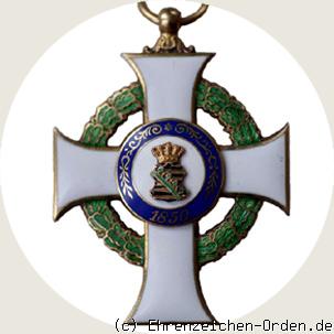 Längliches Kreuz aus Gold oder vergoldetem Silber mit weiß emaillierten Kreuzarmen. Vorder und Rückseite mit aufgelegtem runden Medaillon. Zwischen den Kreuzarmen ein grün emaillierter Eichenlaubkranz. Oben eine Trageagraffe mit kugliger Öse und Bandring.