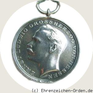 Erstmals gestiftet von Großherzog Ludwig II am 25.September 1843, wurde diese Medaille in 3 Verleihungszeiträumen mit dem jeweiligen Porträt des Herrschers verliehen. Die ersten trugen das Bildnis Ludwig III. ab 1849, dann das Porträt Ludwigs IV ab 1889 und die hier abgebildete Medaille mit dem Bild Ernst Ludwigs ab 1894, dem letzten Herrscher. Verliehen wurde diese Auszeichnung für Verdienste und außerordentlicher Leistungen. Unterschieden werden diese Verdienste durch die rückseitige Inschrift. Folgende Inschriften sind bekannt: – FÜR VERDIENSTE – / – FÜR TREUE DIENSTE – / – FÜR LANGJÄHRIGE TREUE DIENSTE – /- FÜR FÜNFZIG JÄHRIGE TREUE DIENSTE – / – FÜR RETTUNG VON MENSCHEN-LEBEN – / – FÜR WIEDERHOLTE RETTUNG VON MENSCHEN-LEBEN – /