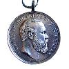 Runde Medaille aus Silber mit erhöhtem Rand. Oben eine angelötete gewöhnliche Öse mit Bandring.