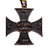 Achtspitziges Kreuz aus Silber. Die Enden der Kreuzarme nur leicht zur Mitte abgeschrägt. Vorder- und Rückseite mit rundem Mittelschild. Zwischen den Spitzen des oberen Kreuzarmes eine angelötete gewöhnliche Öse mit Bandring.