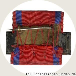 Rechteckige geschwärzte Eisenspange mit vergoldetem Rand. Mittig aufsitzend eine goldene, durchbrochene Krone. Diese angebracht auf einer rechteckigen mit Band überzogenen Metallplatte. Hinten eine waagerechte Anstecknadel.