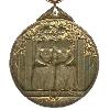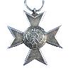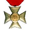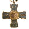 Kreuz aus Bronze mit abgestuften, erhöhten Rand. Die Innenseiten der Kreuzarme sind glatt. Am oberen Kreuzarm eine angelötete Öse mit Bandring. Vorder-und Rückseite mit 14 mm großem Mittelschild.