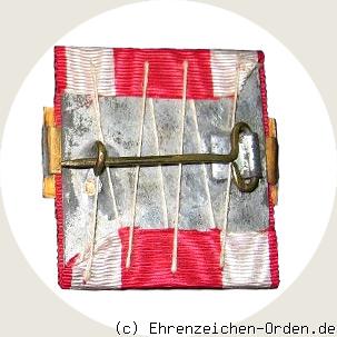 Rechteckige Schnalle aus vergoldeter Bronze. Hinten ein angelöteteter Metallstreifen. Dazwischen wurde das Ordensband gezogen und auf der Rückseite einer Metallplatte vernäht. Auf der Metallplatte eine waagerechte Anstecknadel.