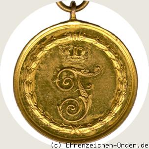 Runde Medaille aus Goldbronze mit Rand. Oben eine angelötete gewöhnliche Öse mit Bandring.