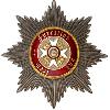 Rechteckige geschwärzte Metallspange mit silbernem Rand. Mittig aufsitzend die silberne Krone. Diese angebracht auf einer rechteckigen mit Band überzogenen Metallplatte. Hinten eine waagerechte Anstecknadel.