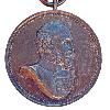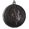 Runde Medaille aus Weißmetall oder Argentan mit erhöhtem Rand. Oben eine angelötete gewöhnliche Öse mit Bandring.