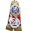 Spange aus geprägtem Silber. Das Mittelteil emailliert. Diese aufgebracht auf einer mit Band bezogenen Platte. (rot mit 4 weißen Streifen je 4mm breit) Die Rückseite der Spange mit Banddurchzug. Das Plättchen mit waagerechter Anstecknadel.