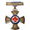 Kreuz aus heller Bronze. Die Kreuzarme mit erhöhten glatten Rändern. Die Innenseiten sind quer schraffiert. Die geschweiften Kreuzarme sind an den Enden seitlich abgeschrägt und leicht nach innen gewölbt. Mittig in der Wölbung jeweils eine kleine Kugel. Vorder- und Rückseite mit großem, runden, mitgeprägtem Mittelschild. Auf der Kugel des oberen Kreuzarmes eine zweite längliche Öse durch die der Bandring geht.