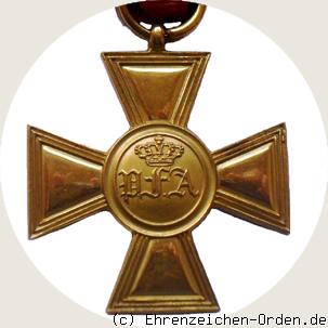 Das Dienstauszeichnungskreuz in Gold für 25 Jahre der Offiziere wurde am 24. Dezember 1838 durch Großherzog Paul Friedrich August gestiftet. Verliehen wurde es an Offiziere die dem Vaterland mindestens 25 Jahre treu gedient haben. Nichtkämpfer und Militärbeamte konnten das Kreuz erhalten wenn sie mindestens einen Feldzug mitgemacht hatten. Verleihungstag war immer der 24. Dezember. Die Feldzugsjahre gegen Frankreich zählten doppelt. Gleichzeitig wurde für Militärs ab dem Feldwebel abwärts (Unteroffiziere) ein Silbernes Dienstauszeichnungskreuz gestiftet. Anlaß zur Stiftung war der 25. Jahrestag des Aufrufs zur allgemeinen Landesbewaffnung durch den Herzog Peter Friedrich Ludwig nach seiner Heimkehr aus dem Exil. Nach Abschluß der Militärkonvention am 15. Juli 1867 mit Preußen wurde die Verleihung an Militärs beendet. Es gibt Kreuze mit dem Herstellerkennzeichen HOSSAUER auf dem unteren Kreuzarm. Dieser lieferte 1844 26 vergoldete Kreuze. Seit 1852 durften Offiziere ein Zweitstück kaufen um den ständigen Wechsel an der Uniform zu vermeiden. Mit der Verleihung war eine Zulage zum Sold verbunden. Die Verleihungszahl wird mit 82 Stück angegeben. Quelle: Friedhelm Beyreiß, Der Hausorden und die tragbaren Ehrenzeichen des Großherzogtums Oldenburg 1813-1918.
