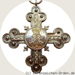 Gerades Kreuz aus Silber. Die Kreuzarme mit erhöhten, abgestuften Rändern. Die Enden der Kreuzarme in Form eines Kleeblattes. In den einzelnen Blättern mittig je ein erhöhter Punkt. Vorder- und Rückseite mit rundem, mitgeprägtem Mittelschild (16 mm). Auf den Geraden der Kreuzarme mittig eine erhöhte, rechteckige Verzierung mit erhöhtem Rand und Zickzackmuster. Zwischen den Kreuzarmen je eine kleine heraldische Lilie. Am oberen Kreuzarm eine angelötete gewöhnliche Öse mit Bandring.
