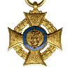 Kreuz aus vergoldeter Bronze mit leicht geschweiften Kreuzarmenden. Die Kreuzarme sind gekörnt und am Rand mit polierten Rändern begrenzt. Vorder und Rückseite mit rundem Mittelschild ( 12 mm ). Zwischen den Kreuzarmen im kleinen Abstand ein Kranz aus Lorbeerblättern rechts und Eichenlaub links.(auch umgekehrt Am oberen Kreuzarm eine kleine Verzierung mit kugliger Öse und Bandring.