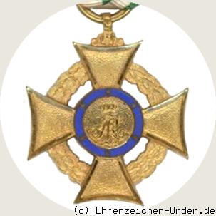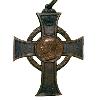 Kreuz aus vergoldeter Bronze mit leicht geschweiften Kreuzarmenden. Die Kreuzarme sind gekörnt und am Rand mit polierten Rändern begrenzt. Vorder und Rückseite mit rundem Mittelschild ( 12 mm ). Zwischen den Kreuzarmen im kleinen Abstand ein Kranz aus Lorbeerblättern rechts und Eichenlaub links.(auch umgekehrt Am oberen Kreuzarm eine kleine Verzierung mit kugliger Öse und Bandring.