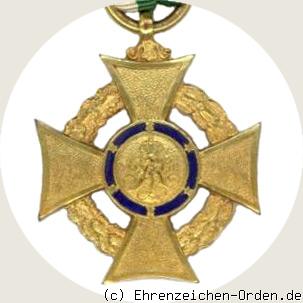 Kreuz aus vergoldeter Bronze mit leicht geschweiften Kreuzarmenden. Die Kreuzarme sind gekörnt und am Rand mit erhöhten, polierten Rändern begrenzt. Vorder und Rückseite mit rundem Mittelschild ( 12 mm ). Zwischen den Kreuzarmen im kleinen Abstand ein Kranz aus Lorbeerblättern rechts und Eichenlaub links.(auch umgekehrt) Am oberen Kreuzarm eine kleine Verzierung mit kugliger Öse und Bandring.