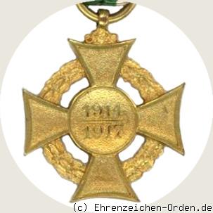 Eine Verordnung vom 11.Oktober 1915 bestimmte die Umbenennung in Ehrenkreuz. Der Unterschied bei Verleihung im Frieden ist einerseits der rot emaillierte Ring auf dem vorderen Medaillon und die Rückseite mit rot emailliertem roten Kreuz auf weißem Grund. Auf den Mittelschilden der Rückseite für Kriegsverdienst kommen 2 Versionen der Zahlen vor 1914/1915 oder 1914/1916. Am 31.März 1916 wurde das Ehrenkreuz in Ehrenkreuz für freiwillige Wohlfahrtspflege umbenannt. Seit Mitte 1916 wurden die Kreuze aus einem Stück geprägt und die Schildchen wurden flacher und das Kreuz dünner. Hier sind folgende Jahreszahlen auf der Rückseite: 1914/1916, 1914/1917 und 1914/1918. Quelle: J. Nimmergut, Deutsche Orden und Ehrenzeichen bis 1945, Bd. III, 1999.