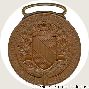 Das Ehrenzeichen für 40 Jahre in einer freiwilligen Feuerwehr wurde am 28. August 1898 durch Großherzog Friedrich I. per Verordnung gestiftet. Vorausgegangen war bereits die Stiftung eines Ehrenzeichens für 25 Jahre in der freiwilligen Feuerwehr am 21. Dezember 1877. Diese Stiftung wurde dann 1898 ergänzt. Voraussetzung war der ununterbrochene, treue Dienst in einer freiwilligen Feuerwehr und bei 40 Jahren die vorherige Verleihung der Spange für 25 Jahre. Der abgeleistete Militärdienst wurde berücksichtigt. Diese Auszeichnung war nicht rückgabepflichtig und konnte nach dem Ausscheiden aus dem aktiven Dienst weiter getragen werden. Wie bei vielen Auszeichnungen wurde gegen Ende des 1. Weltkrieges die Bronze durch Kriegsmetall (Zink) ersetzt. Quelle: J. Nimmergut, Deutsche Orden und Ehrenzeichen bis 1945, Bd. I, 1997.