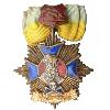 Runde Medaille aus vergoldeter Bronze ohne erhöhtem Rand. Oben eine breite Bügelöse zum Durchzug des Bandes.