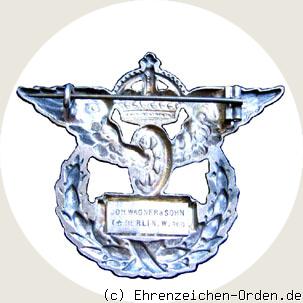 Hohl geprägtes, durchbrochenes Steckabzeichen aus Silber. Hinten eine waagerechte Anstecknadel. Auf der Rückseite eingestanzt der Hersteller.