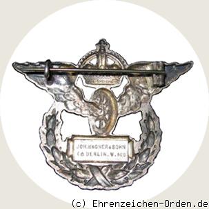Hohl geprägtes, durchbrochenes Steckabzeichen aus Silber. Schild und Krone sind vergoldet. Hinten eine waagerechte Anstecknadel. Auf der Rückseite eingestanzt der Hersteller.