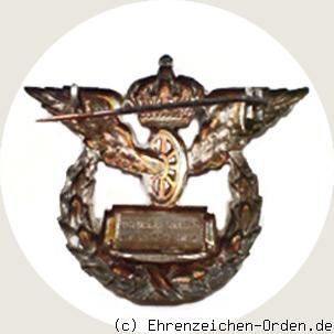 Hohl geprägtes Steckabzeichen aus Silberblech teils vergoldet. Hinten eine waagerechte Anstecknadel. Unten ein Schild mit der Herstellerbezeichnung.