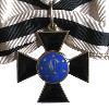 Durchbrochen gearbeitetes Abzeichen aus Silber. Dieses aufgebracht auf eine rechteckige, mit dem Ordensband des Hausordens der Hohenzollern bespannte Spange. Hinten eine senkrechte Anstecknadel.