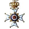 Kreuz aus Bronze mit abgerundeten Kreuzarmen und glatten Rändern. Ein rundes Mittelschild auf Vorder-und Rückseite. Die Innenseite der Kreuzarme ist quer schraffiert und eingerahmt. Oben eine Öse mit Bandring.