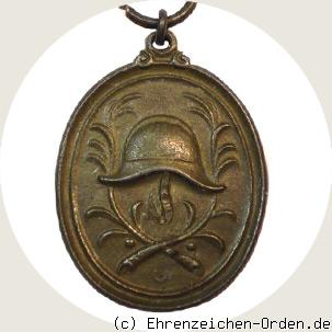 Ovale Medaille aus patiniertem Zink mit breitem Rand. Innen begrenzt von einer schmalen Linie. Oben eine Verzierung mit quer stehender Öse. Darin ein kleiner Ring mit Bandring.