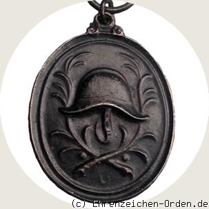 Ovale Medaille aus geschwärztem Eisen mit breitem Rand. Innen begrenzt von einer schmalen Linie. Oben eine Verzierung mit quer stehender Öse. Darin ein kleiner Ring mit Bandring.