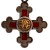 Hohl gefertigtes Kreuz aus Gold mit leicht gebogenen Kreuzarmenden. Die Kreuzarme sind gold bordiert mit weiß emaillierten Innenseiten. Vorder-und Rückseite mit aufgelegtem runden, goldenem Medaillon. Zwischen den Kreuzarmen jeweils 5 goldene Strahlen. Auf dem oberen Kreuzarm eine quer stehende Öse mit länglichem doppeltem Bandring.