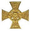 Achtspitziges Kreuz aus Gold, hohl gefertigt. Die Kreuzarme sind gold bordiert und weiß emailliert. Vorder-und Rückseite mit rundem Mittelschild auf einem 8-straligen Sternenkranz. Durch die Mitte gehen 2 gekreuzte goldene antike Schwerter. Zwischen den Spitzen des oberen Kreuzarmes eine verzierte Agraffe mit einer Kugelöse und Bandring.