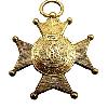 Achtspitziges Steckkreuz aus vergoldetem Silber mit kleinen Kugeln an den Kreuzarmspitzen. Die Kreuzarme sind gold bordiert und weiß emailliert. Auf der Vorderseite ein rundes Mittelschild auf einem Sternenkranz. Durch die Mitte gehen 2 goldene, gekreuzte, antike Schwerter. Hier beidseitig geprägt. Hinten eine senkrechte Anstecknadel.