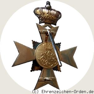 Achtspitziges Kreuz aus Gold. Die Kreuzarme auf der Vorderseite mit goldenen Rändern sind weiß emailliert. Mittig aufgelegt ein achtstrahliges Medaillon. Das runde Mittelteil ist emailliert. Zwischen den Spitzen des oberen Kreuzarmes zwei verzierte Stege an der die gefütterte, goldene Krone beweglich verbunden ist. Die Rückseite ist glatt und golden. Mittig ein aufgelegtes rundes Medaillon. Senkrecht eine Anstecknadel mit Gegenhaken.