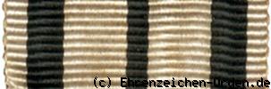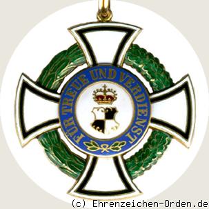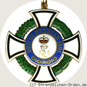 Kreuz aus Gold oder Silber vergoldet. Die Kreuzarme sind Gold bordiert und weiß emailliert. Innenliegend im Abstand vom Rand ein breiter, gold geränderter, schwarz emaillierter Streifen. Die Kreuzarmenden sind nach außen abgerundet. Vorder- und Rückseite mit aufgelegten, runden Mittelschildern. Zwischen den Kreuzarmen, in kleinem Abstand vom Medaillon, umlaufend ein grün emaillierter und gold bordierter Kranz aus rechts Eichenlaub und links Lorbeerlaub.(Vorderseite) Am oberen Kreuzarm eine parallel angelötete gewöhnliche Öse mit doppeltem, länglichen Bandring.